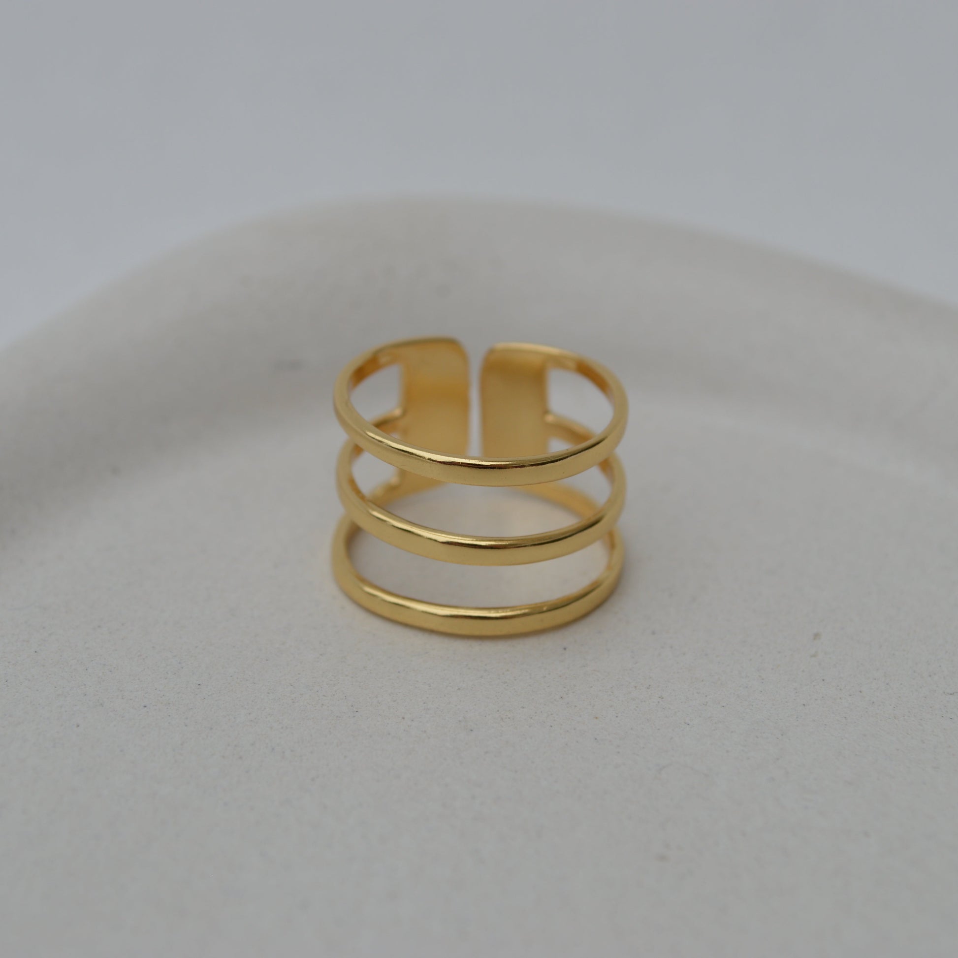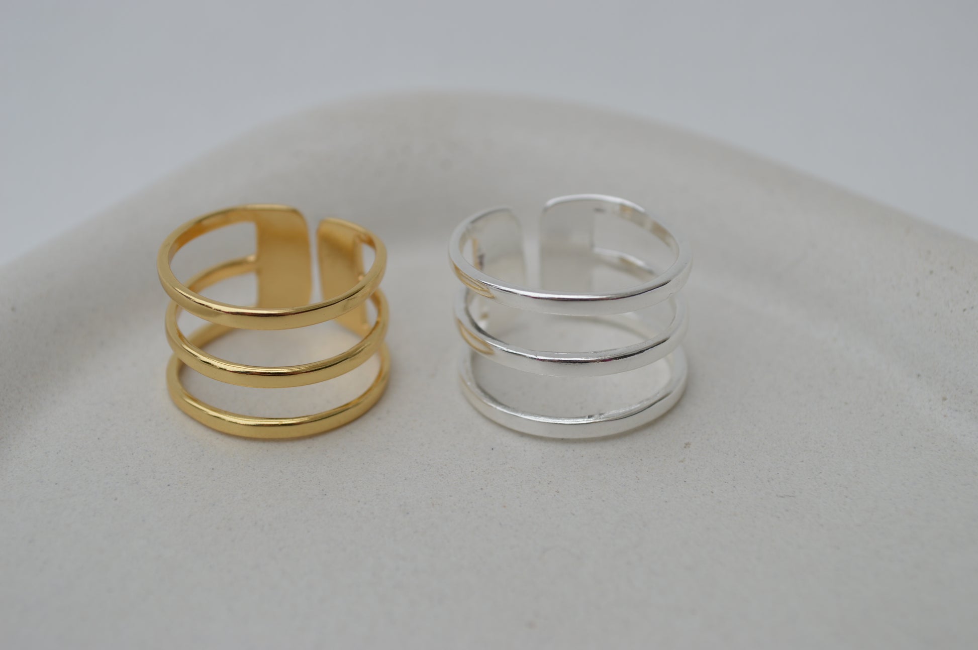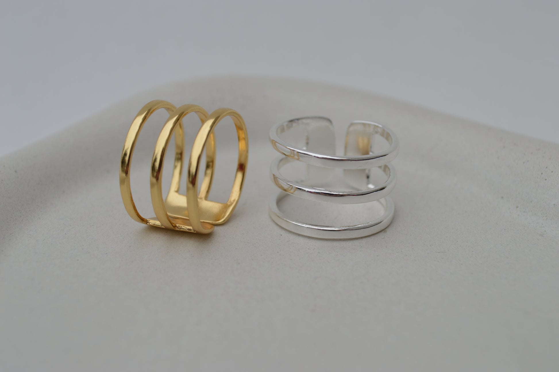 O Anel Circuito traduz o encontro entre forma e fluxo. Tem um design moderno, com três linhas metálicas paralelas e estrutura aberta confere leveza e movimento.